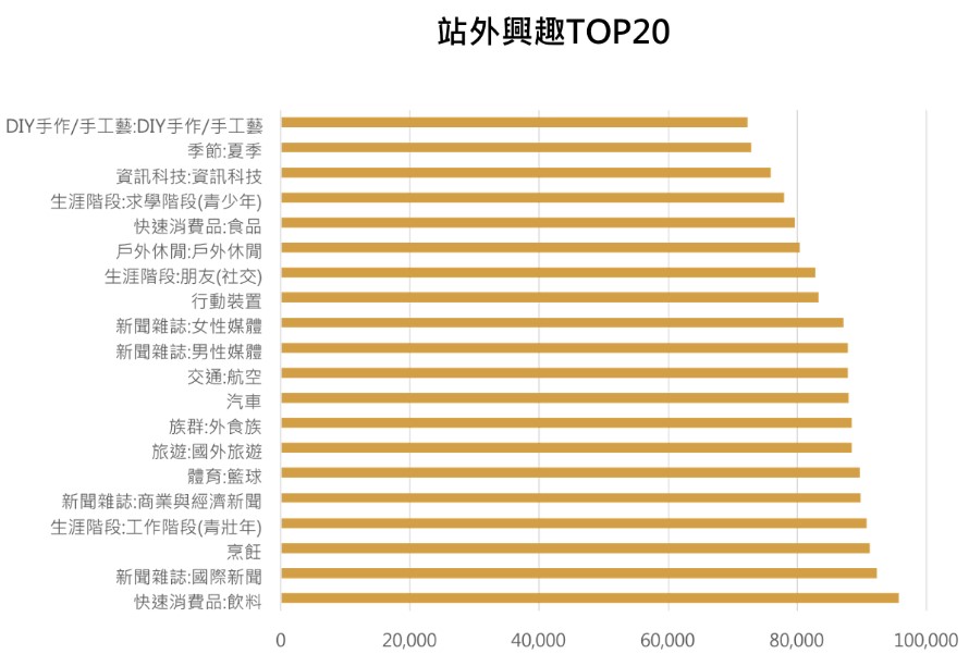我們除了觀察使用者在域動平台所屬分群資料外,同時也參考進站使用者於站外感興趣議題。在上圖中可看到這些使用者於站外感興趣的議題前三名為:飲料、國際新聞雜誌和烹飪。於是,我們用數據分析的結果讓客戶知道,異業合作的對象還可擴大設定為飲料業者、雜誌媒體或廚具食材等相關廠商。
