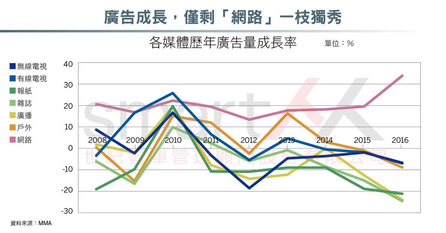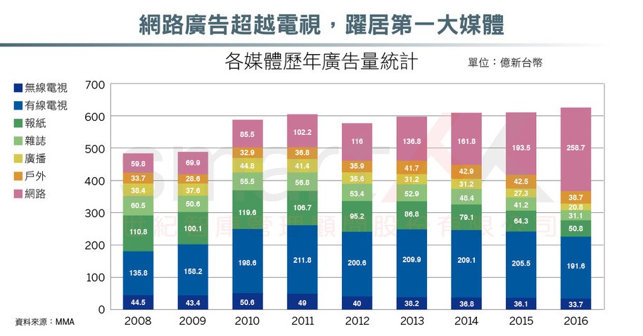 從兩張圖表上可看到,網路在2016年已成為最大的廣告平台;而數位廣告之所以能夠異軍突起,並且以一支獨秀的狀態施展魔力的原因,除了消費者使用習慣改變之外,也因為數據可以被記錄、追蹤和分析的特性,讓數位廣告的成長幅度遠遠大於其他傳統媒體。
