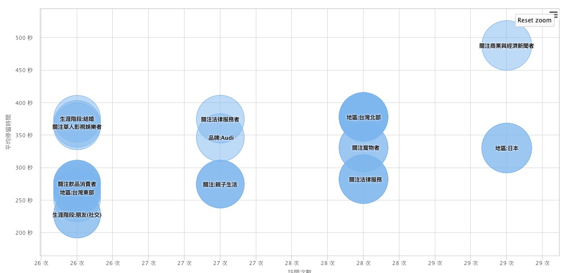 2. 打撈帶有「關注商業與經濟新聞者、地區:日本、地區:台灣北部、關注寵物者、關注:金融服務、關注法律服務者、品牌:Audi、關注:親子生活」等八個標籤人群,並且加重投放廣告量