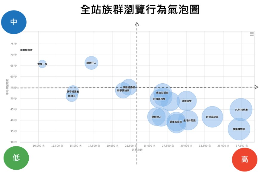 造訪次數前三名為: 3C科技玩家、享樂購物族和時尚品味家