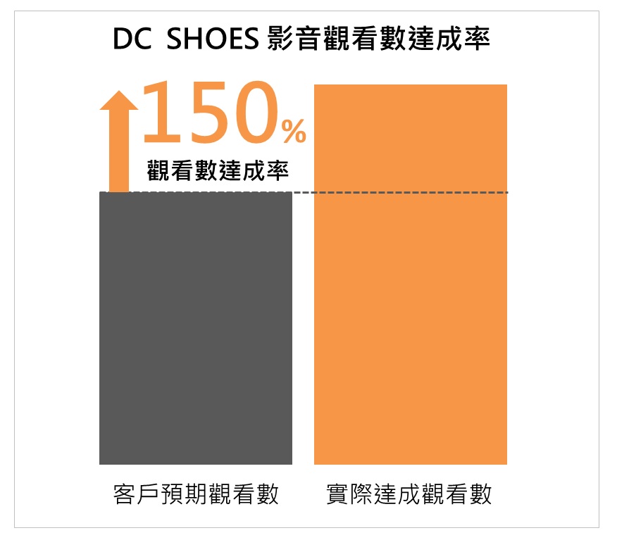 DC SHOES優異的影音素材,以強調自我主張的口號宣傳品牌理念和生活態度,成功吸引目標族群的目光,引起共鳴。加上MULTIFORCE精準廣告投遞技術,讓影音廣告觀看數超標達成150%!MULTIFORCE影音廣告必須觀看30秒以上才能計算觀看次數,顯示這次宣傳成效除了完整將行銷內容傳遞給消費者外,也成功觸及最多的目標TA。