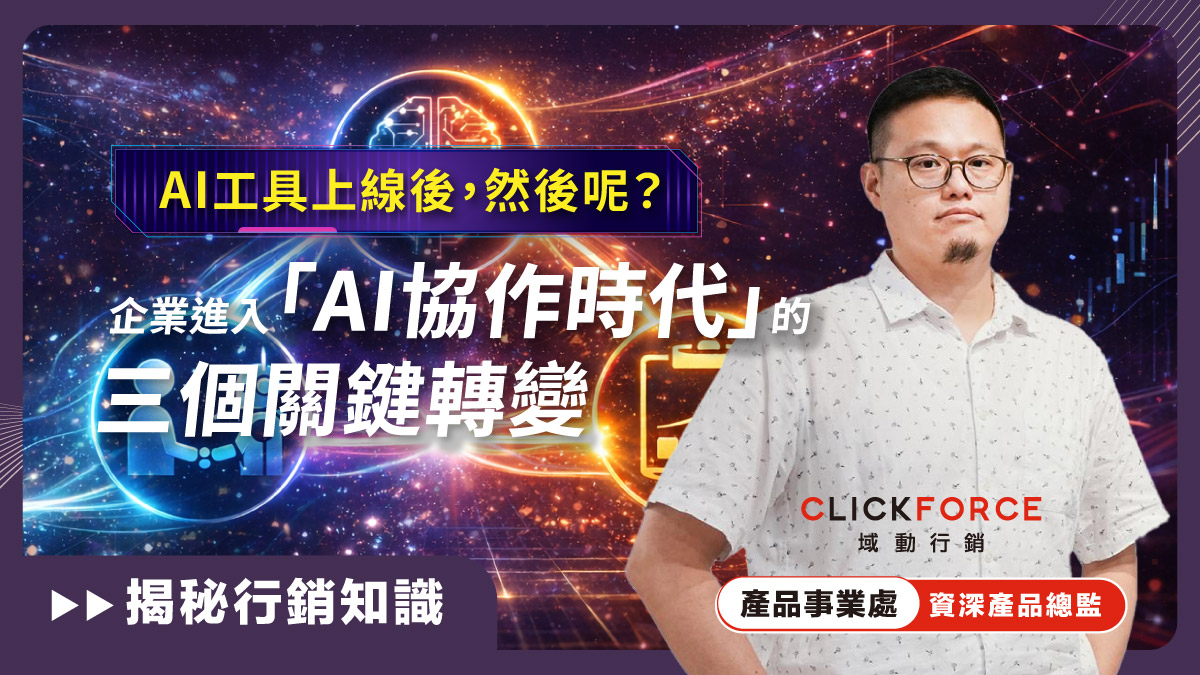 在 CLICKFORCE 的 AI 翻轉之路上,我們也與多家品牌與產品團隊持續交流並觀察到,當 AI 正式進入日常工作流程,企業關注的問題已經從「是否導入 AI」轉變為「如何與 AI 協作」。這意味著,對於 AI 的態度不該停留在把 AI 當成成型化的軟體工具,而是整個商業社會都因 AI 而逐步改變工作的模式與組織結構。以下整理出企業在 AI 時代中,最值得關注的三個關鍵轉變: