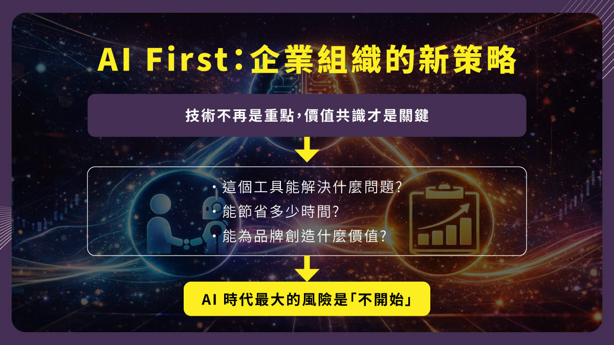 目前 AI 的發展仍處於快速變動的階段,市場沒有一套固定答案,也沒有標準的使用方式。但這同時也是企業最重要的機會期。在這樣的時代裡,最大的風險並不是使用錯誤的 AI 工具,而是完全不開始嘗試。企業與個人都需要透過實際使用、試錯與優化,逐步建立屬於自己的 AI 協作模式。